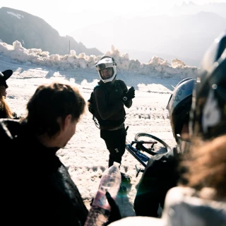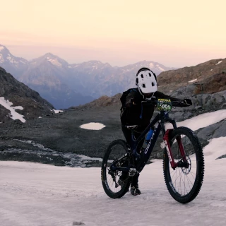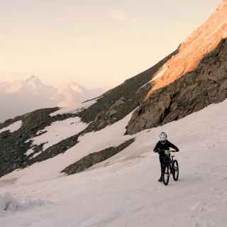 Mit dem ersten Tageslicht erreicht er die Zielgerade – ein großes, extrem steiles Schneefeld. Über sich sieht er die Bergstation der Seilbahn. Als die anderen Fahrer im Tal aus den warmen Betten kriechen und in die Pantoffeln schlüpfen, legt er die Steigeisen an, um den Gletscher zu erklimmen. Noch nie zuvor hat er die hochalpinen Steighilfen unter seine Schuhe geschnürt. Allein das ein Abenteuer. Maël Feron muss sein Rad jetzt schieben – oder tragen. Die dünne Luft erschwert die Plackerei zusätzlich. Jetzt ist seine Ausdauer gefragt. Er atmet tief, Schritt für Schritt, die Gebäude auf dem Gipfel fest im Blick.