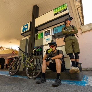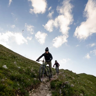Throughout the day, Jules and Valentin tackle a demanding and varied route. Steep climbs over rocky hiking trails in the forest alternate with fast gravel descents across alpine meadows and winding singletrack with significant exposure. The route is tough – and stunning. Short breaks are used to eat – energy gels, sugary drinks.